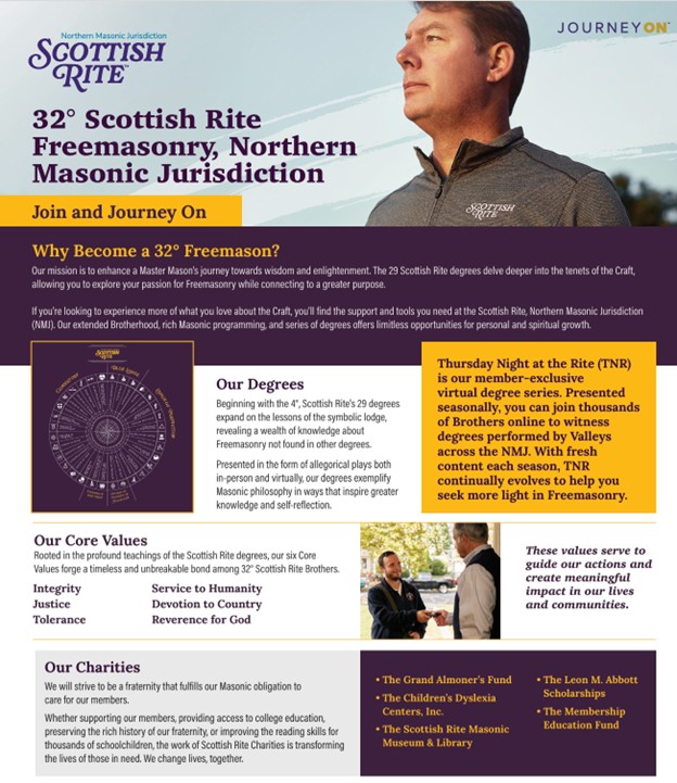 In 32° Scottish Rite Freemasonry, a Master Mason builds upon the ethical teachings and philosophy offered in the first three degrees of Blue Lodge. A Scottish Rite Mason seeks to delve deeply into the tenets of the Symbolic Lodge in order to continue the journey to more light and greater wisdom and self-improvement.